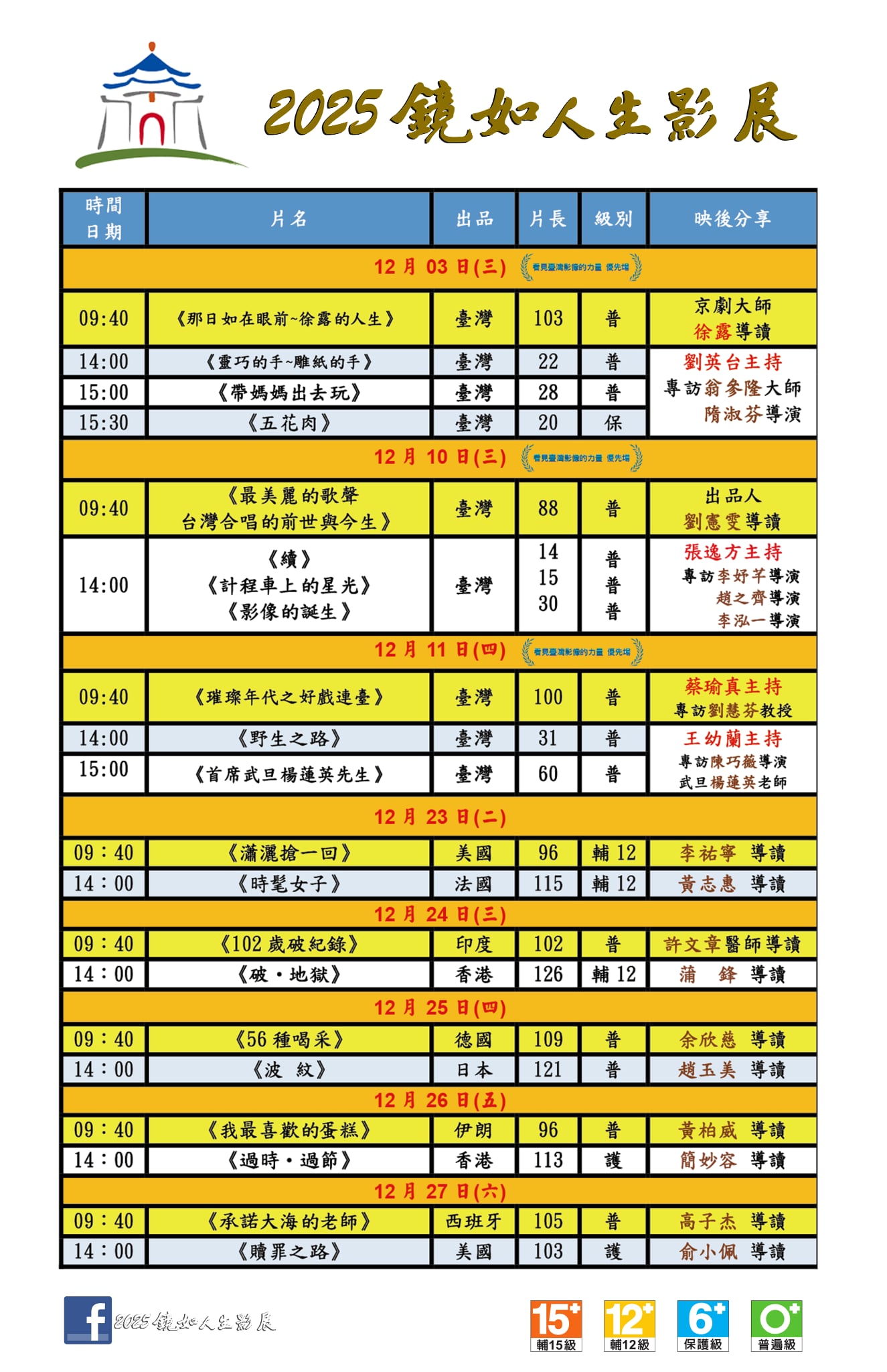 邀您一起來悅讀電影、豐足心靈、感受生命之美。 《2025鏡如人生影展》12/3隆重登場 由中華世界影像教育推廣協會與國家中正紀念堂聯合主辦的第11屆《2025鏡如人生影展》,將於12月3日至27日在中正紀念堂演藝廳重登場。理事長劉英台表示:「期待透過優質電影導讀,跨越文化與世代,激發觀眾探索生命的深廣度,這也是本影展最大特色」。本影展為公益活動,所有場次均免費入場,請提前20分鐘排隊索票進場。同時每場電影均有專業導讀與映後座談,期待引領觀眾重新思考人性與生活的意義。 適逢中正紀念堂演藝廳以頂級電影院規格重新裝修,觀影品質將耳目一新,誠摯邀請舊雨新知於歲末年終感受一系列心靈洗禮。 本屆主題為「悅讀影像擴展視野、尋回生命吉光片羽」,精選全球10部溫暖劇情長片與11部深具地情感的臺灣作品,以家庭、成長、老年、性別、歷史記憶等為主題,邀請觀眾走進生命之旅。