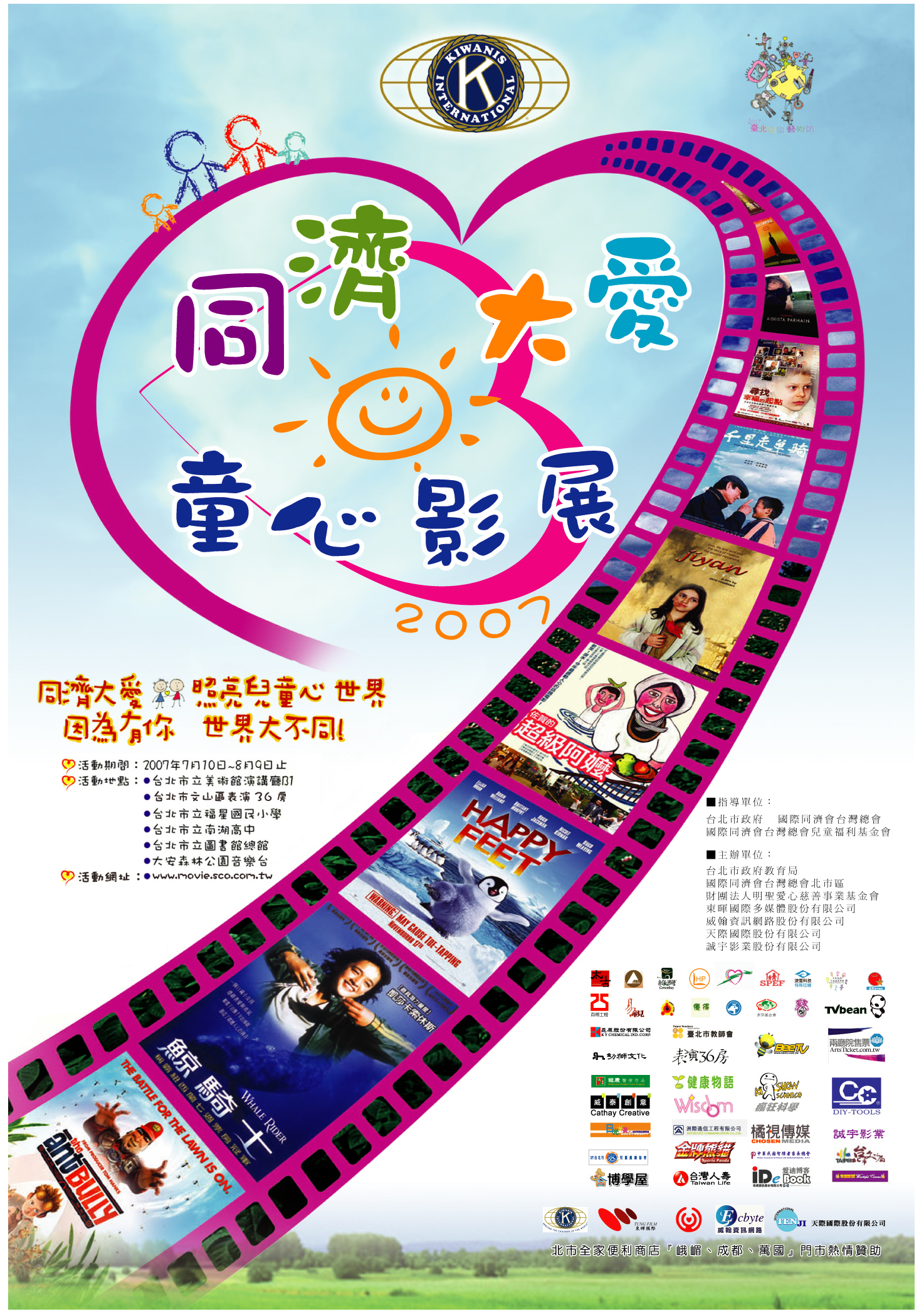 活動期間:2007年7月10日起至8月9日止 活動地點: (1) 台北市立美術館演講廳B1、 (2) 台北市文山區表演36房 (3) 台北市立福星國民小學、 (4) 台北市立南湖高中 (5) 台北市立圖書館總館、 (6) 大安森林公園音樂台 ■指導單位:國際同濟會台灣總會、國際同濟會台灣總會兒童福利基金會 ■主辦單位:國際同濟會台灣總會北市區、台北市政府教育局、財團法人明聖愛心慈善事業基金會、東暉國際多媒體股份有限公司、威翰資訊網路股份有限公司、天際國際股份有限公司、誠宇影業股份有限公司