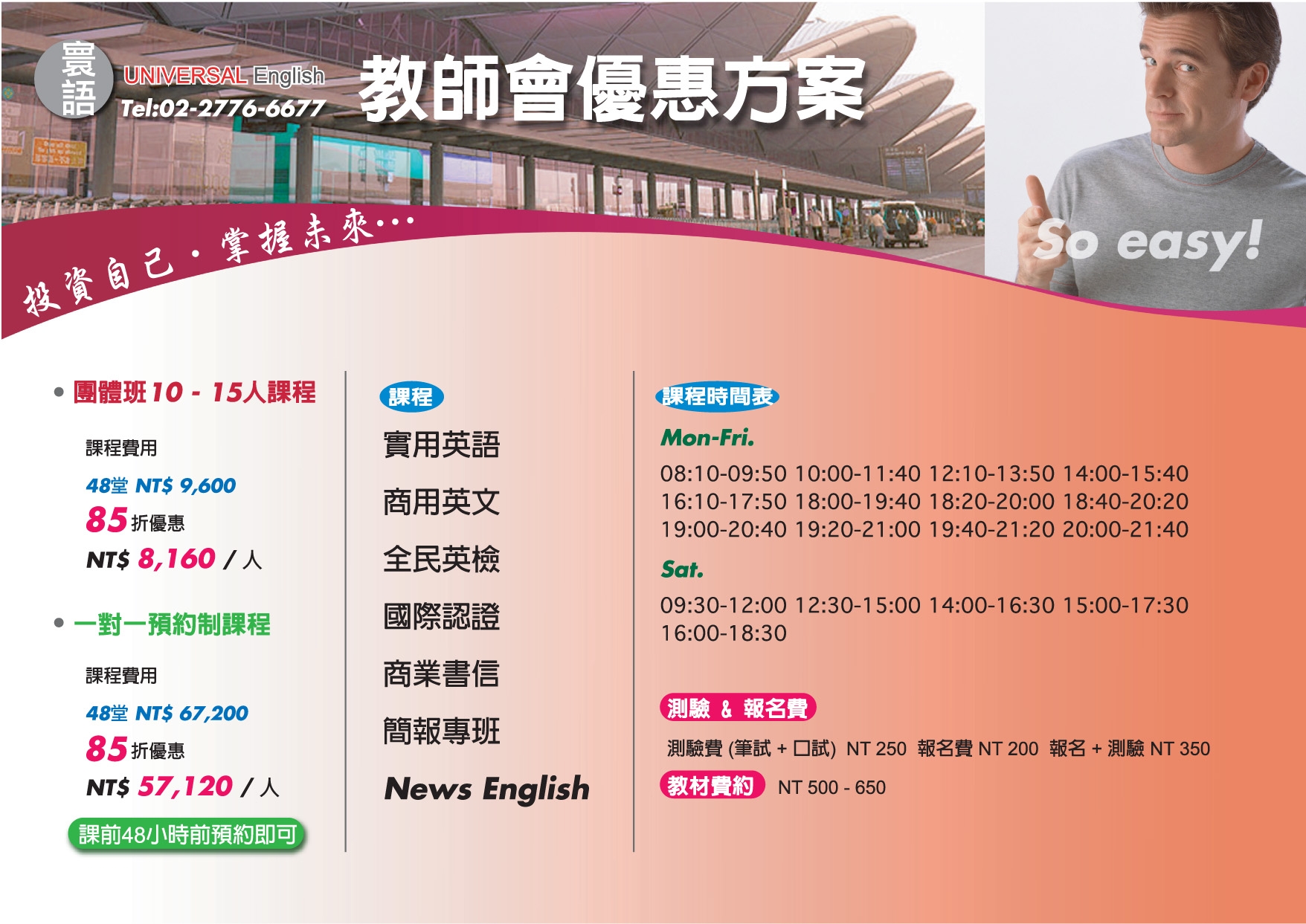 寰語UNIVERSAL English 連絡人:江正慧 電 話:02-27766677 傳 真:02-87732442 地 址:106台北市大安路一段84巷8號1樓