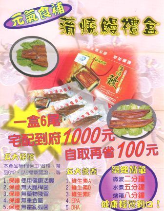 品名:元氣食補特極蒲燒鰻禮盒 規格143g±10%/ 尾 * 6尾 市價:1350,優惠價:1000元 貨運金額:免運費 (訂購金額達1000元,同一送貨地點) 品質保證:若非人為操作不當而品質出狀況,請將送貨單及壞品於七日內寄回申請換貨。 訂貨程序:請填妥上列訂貨單,連同付款收據 傳真或EMAIL 到公司信箱,我們會有專人於二十四小時內與您確認訂單。若無人去電,請再來電話確認訂單。 客戶服務:對購買流程、付款方式及商品運送不清楚,請聯絡客服專線 :(02) 2586-9378 康多福企業股份有限公司 服務電話: 2586-9378 傳真: 2586-9358 地址:台北市重慶北路三段278-1號6樓