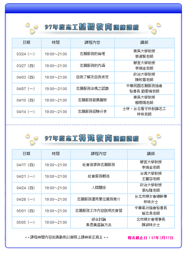 台北市婦女會將於3月份舉辦志工教育訓練課程, 協助志工取得志工服務手冊, 歡迎各位老師報名參加,謝謝。 此次志工課程之相關內容如附件