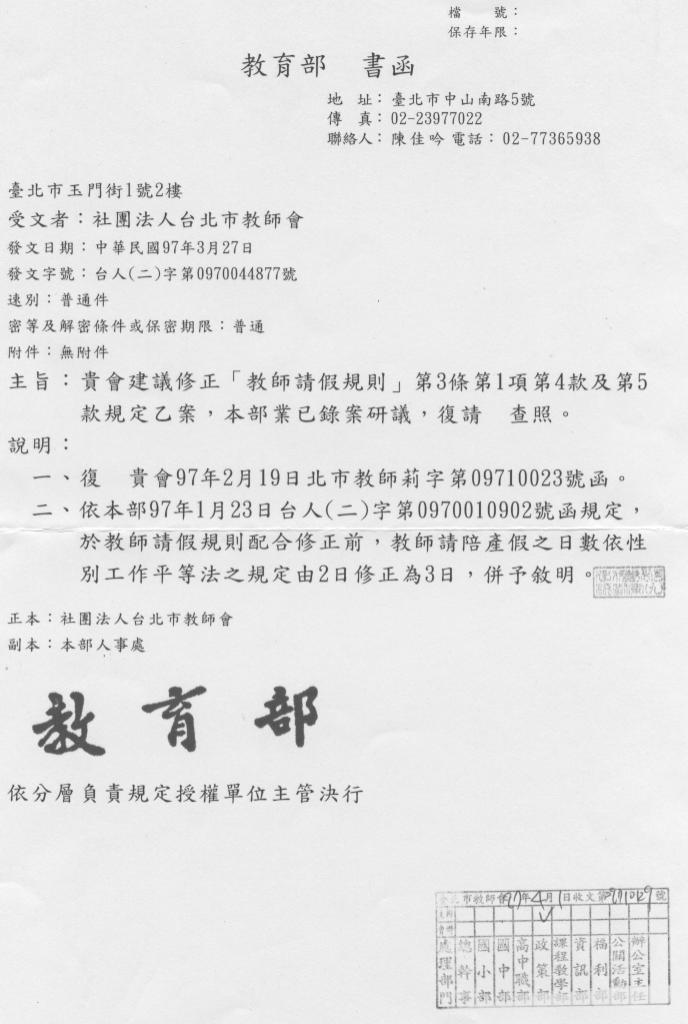 教育部回函--就建請教育部修正「教師請假規則」教部回函