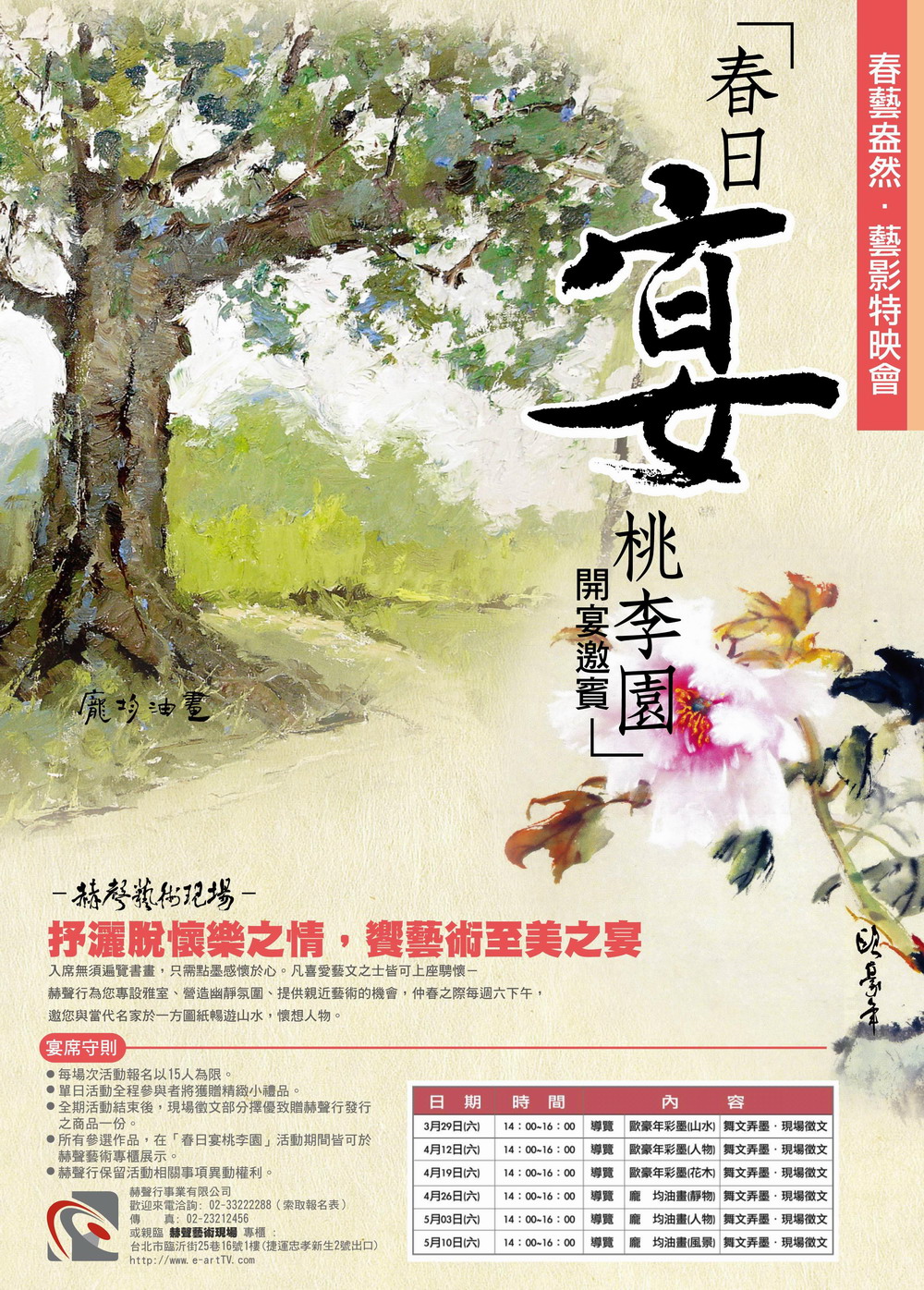 赫聲行目前規劃每週六舉辦免費藝文活動, 現場備有精緻茶點與小禮品, 活動在3/29已舉辦過一次,參加者都給予高度肯定, 因此我們誠摯邀請平日教學繁忙的老師, 在假日可以喘口氣休息一會兒,讓自己有個親近藝術的機會!