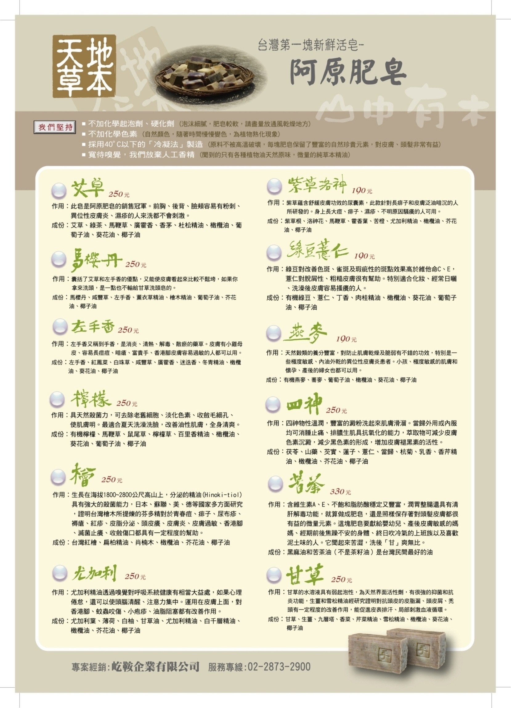 您每天用什麼清潔自己的肌膚? 神農我們不熟,本草像傳奇的寶典。 可是我們常聽說西瓜清涼退火、綠豆去濕解毒、艾草驅蚊還除障。連媽媽鬢腳的白花油味道,冬天麻油下鍋的氣息都是安頓我們身心的良方。 尋常生活尋常物,物物有方,方方入藥。上蒼公平的給了每人一帖專屬的良藥,叫做自然。 我們吃得很小心,用得很仔細,可是對清潔肌膚的東西往往無從選擇。除非只用清水,否則躲不開化學(可是連自來水都添加了氯!)。 痘痘、疹疹、紅紅、癢癢總是擦了藥就緩解,不擦藥又犯! 不是我們搽的藥沒效,也不是我們免疫力太差,是因為每一天我們都使用飽含色素、香精和防腐劑的潔膚用品來對待自己的肌膚。 肌膚不斷和這些化學東西作戰,永無休息之日。拿起一塊(或一罐)顏色很美、味道很香、可以保存三年或五年的潔膚用品,其實你明白,它們是添加了什麼才能夠保存那麼久。 要不要試試看停用那些東西一段時間,肌膚的變化就真的發生了﹍