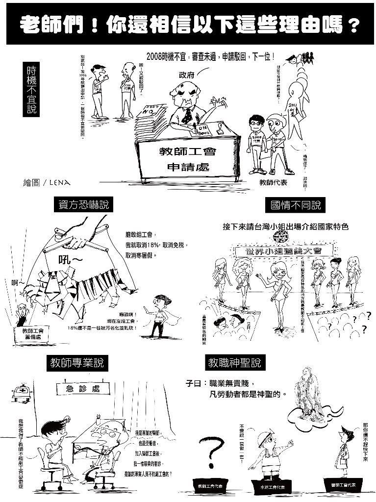 教師工會文宣 三之3 ◎全國教師會「教師組織轉型及發展策略小組」 全教會一如過去,不會讓教師夥伴孤單或徬徨。 針對未來工會法、勞資爭議處理法修法,與組織轉型問題,全教會未來一年努力方向如下: 一、 我們將結合所有進步團體與媒體的力量,積極遊說立法院通過進步版本,以爭取完整勞動三權保障為目標。 二、 我們已結合本會教師法、工會法修法小組,成立「教師組織轉型發展小組」,通盤因應修法與組織轉型工程,建立轉型作業程序,方便大家運作。 三、 我們會持續透過組織文宣,批判各種反對教師工會之謬論,建立教師工會之專業形象。 四、 我們會積極與各縣市教師會聯繫,共同將組織轉型列為最重要工作,形成另一波教師自覺運動。 在工會法可能三讀之前,我們看到各種反撲動作正在考驗大家,例如:桃園縣教育處竟拿著教育部以前嚇老師--現在也不敢再用的資料,要求校長轉寄給全校老師以混淆視聽,桃園縣官員公然把馬總統政見講成毒藥,將成為歷史的笑柄,也是執政者上下混亂的最好明證。 教師能不能組工會,該不該組工會,組了工會該盡怎樣的努力,我們自己來詮釋!我們一起來創造! 【另有漫畫文宣,請開啟附件瀏覽,謝謝!】 |