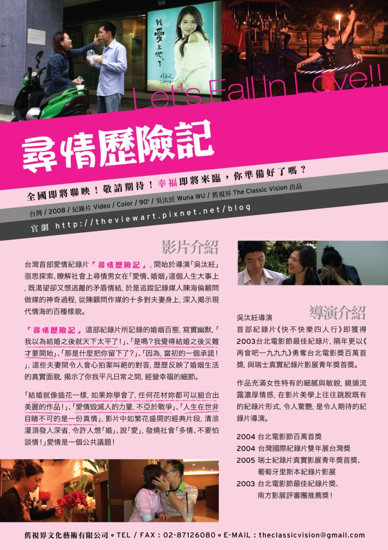 尋情歷險 內容介紹︰ 與導演汰紝從小一起長大,立志嫁得如意朗君,卻也一起情路坎坷的姊妹淘逸帆,傳來囍訊:我要結婚了。看到好友幸福洋溢,理當祝福,但在祝福的同時,汰紝心中卻也不免孤單落寞。 姊妹淘逸帆的婚姻,是經由一位風格特立獨行的陳顧問做媒成功的,做媒是陳顧問的興趣,雖是興趣,但這位陳媒婆,卻有一套自己對婚姻與媒合的見解,她解剖男女問題之犀利,踢上臨門一腳之快狠準的程度,沒見過本人,還真難以想像。 話說從頭,導演汰紝,三十歲時,被炸了七張紅色炸彈,看見自己到了該探究婚姻的年紀,卻也發現自己在愛情學分中,可是不及格到家,開始決心研究愛情的道理,也因此認識陳媒婆,三年過去,自己沒有被做媒成功,反倒是姊妹淘逸帆幸福洋溢,這究竟是怎麼回事?到底是哪個關鍵點出了差錯?為何新娘不是我?到底有什麼是別人有,我沒有的?導演汰紝,決定用最擅長的工具—拍電影,步上探索之路,開始尋訪陳顧問做媒成功的夫妻們,從他人的經驗中,找尋成功之道,起初,這是一場富有科學精神的研究,殊不知後來卻成為被淚水淹沒的冒險。 在導演汰紝探索的過程中,首先最令她好奇的是男小女大的CC和Cube,一個是說話彷彿來自外太空的二十八歲宅男Cube,一個是原本誓死不婚堅信結婚只是陷阱的四十歲女秘書CC,兩人在陳顧問花了十年的工夫,敲邊鼓越敲越熱,最後兩人終於一時天雷勾動地火,步上紅毯的另一端。婚姻對原本孤單的他們而言,是找到一輩子相互扶持的朋友。 接著,在一對對夫妻談論他們步入婚姻的過程當中,最令人笑中帶淚的是愛娟和施先生這一對,在公園重演當初女追男的搞笑求婚過程,愛娟和施先生都是離婚之後再婚,在愛娟的剖白之中,講述了她如何從離婚後害怕自己再度陷入失敗之中,到終於面對自己內在真實的渴望,勇敢跨出腳步,追求幸福,她的努力在施先生疼惜的相待之中,無言自證,令人動容,失敗並不可怕,重要的是要知道失敗在哪裡,從哪裡再度站起。 這番道理,在陳顧問勉勵離婚的Judy的話語中,也讓導演明白婚姻的失敗,不會只是婚姻的問題,同樣的問題在生活其他領域也都會發生,去面對、學習、改變,擁有愛人的能力,那才是真諦。 汰紝導演在這樣的探尋之中,一對對夫妻們的真情表白,都再再的刺激她內心深處對情感的渴求,遲遲的找不到對象的窘境,讓導演不免有,他X的,找一個相愛的人真的有那麼難嗎?的憤怒,後來終於決定請已經將做媒發揚光大到藝術化境界的陳顧問幫忙,而令人驚愕的是,陳顧問並沒有幫她介紹對象,反而請導演把喜歡的人帶來,於是導演鼓起勇氣,打電話邀前男友前來,開始一場刺激無比的冒險! 在這番冒險當中,汰紝導演發現愛情悲劇的發生,來自於:「恨你不完美」,情侶之間忽略多數的優點,執著於少數缺點而互相廝殺,毀了原本能夠美滿的戀情! 汰紝導演更真實的了解:「愛情毀滅人的力量,不亞於戰爭」的名言,她繼續的探索,從一對對夫妻的真實歷程,去了解許多愛情的難題,到底是什麼道理!沉默的男人,心碎的女人?背叛與被背叛,誰痛苦?戀愛與結婚的差別?也親眼見識了「先定婚期,再找新郎」的有效率作媒法。在無數震撼的洗禮當中,尋情.歷險!這個拍攝過程對她來說,無疑是一場生命洗禮,從一開始「找到一個相愛的人有那麼難嗎?」的疑問,到拍攝完成之後,她肯定自己「相愛的能力」,吳汰紝導演仍然其一貫誠懇創作的風格,將每部片的拍攝,看待為自己生命探索的旅程,將她探索所得到的答案,分享給每位觀眾。