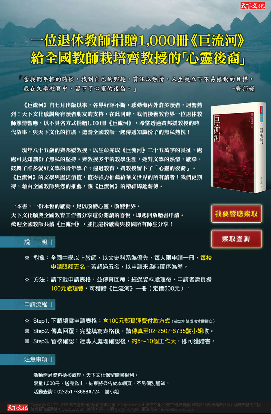 ■活動說明: (一)對象:全國中學以上教師,以文史科系為優先,每人限申請一冊,每校申請限額五名,若超過五名,以申請來函時間序為準。 (二)方法:請下載申請表格,並傳真回覆;經過資料處理後,申請者需負擔100元處理 費,可獲贈《巨流河》一冊(定價500元)。