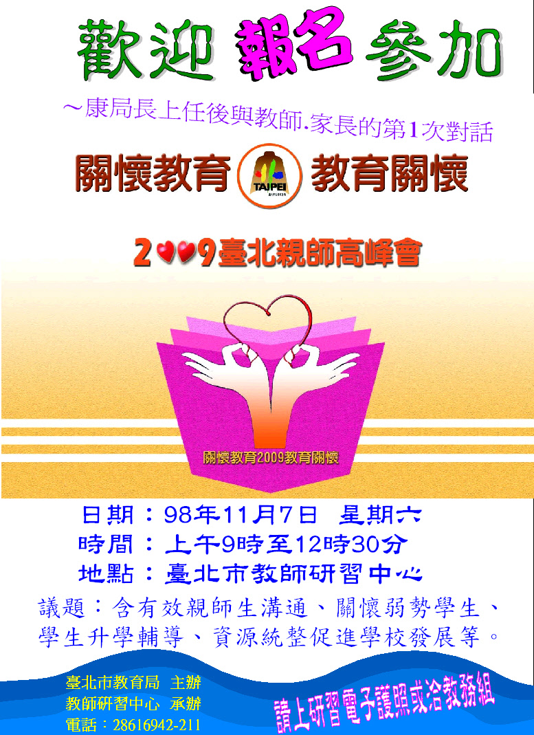 「教育關懷 關懷教育」 歡迎每位關懷教育的人參加「2009親師高峰會」