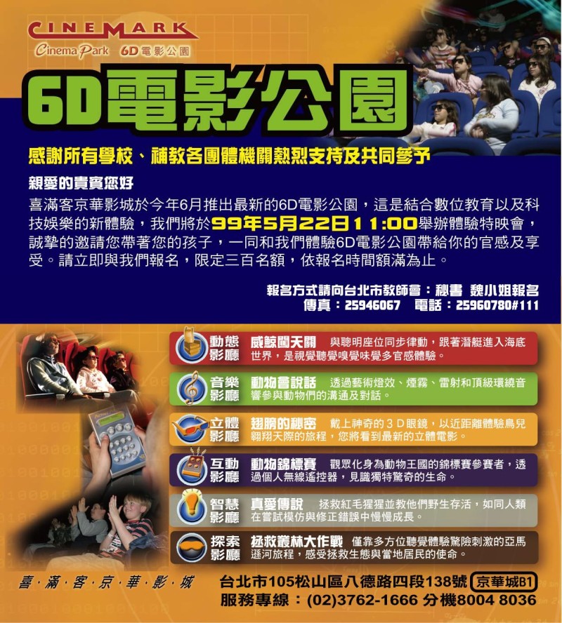 台北市教師會京華城喜滿客6D電影公園欣賞 一、片名:動物總動員 二、放映時間:5月22日星期六上午11時~下午13時(10時45分前進場完畢,以利說明注意事項,請準時入場) 三、放映地點:台北市松山區八德路四段138號B1F 京華城地下一樓喜滿客影城 四、報名與公告:即日起接受報名,開放二百人,額滿為止,5月19日星期三下午五點本會網站公布錄取名單,每位會員教師用會員證至多可報名三人 請利用傳真或E-MAIL向台北市教師會 秘書 魏小姐報名 E-mail:yuling@tta.tp.edu.tw 傳真:25946067 電話:25960780~111