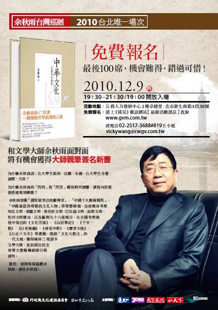 (活動訊息代轉)12月9日(四)余秋雨台灣巡迴 台北特別演說 |