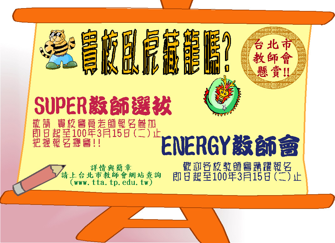 請上台北市教師會網頁查詢詳請 SUPER教師選拔( http://www.tta.tp.edu.tw/1_news/detail.asp?titleid=3403) Energy教師會選拔(http://www.tta.tp.edu.tw/1_news/detail.asp?titleid=3404) 或於下方下載簡章 |