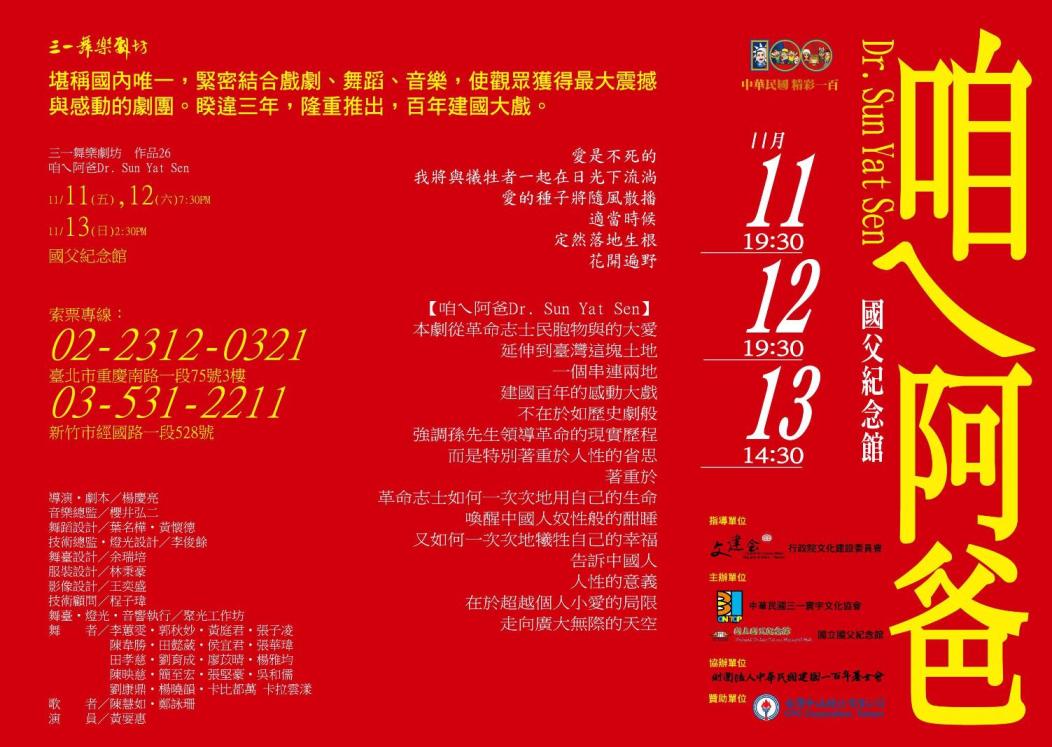 指導單位:行政院文化建設委員會 主辦單位:中華民國三一寰宇文化協會.國立國父紀念館 協辦單位:財團法人中華民國建國一百年基金會 節目名稱:三一舞樂劇坊【咱ㄟ阿爸Dr. Sun Yat Sen】 演出單位:M&B舞劇團 團長:楊慶亮 演出類型:音樂舞劇 演出日期、地點:2011年11月11?13日國立國父紀念館 演出型式: 本劇以「音樂舞劇」的形式展演,主體以音樂與舞蹈型式並呈,同時結合戲劇元素,一方面可以使觀眾對於劇情有更深入的了解;另一方面,更深的企圖,嘗試以音樂舞劇型式,開創舞臺新風格,將表演藝術的可能性,做更多面向的拓演與開創。