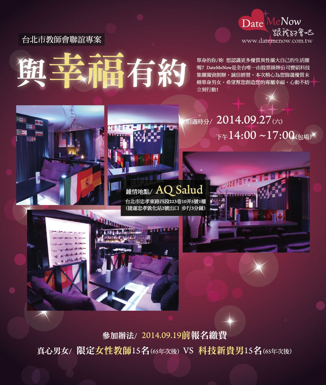 台北市教師會「與幸福有約」未婚聯誼專案 一、 活動日期︰2014年9月27日(星期六) 下午14:00~17:00 二、 活動地點:AQ salud電話: 02-27119809 地址:忠孝東路四段223巷10弄5號1F (出忠孝敦化站2號出口步行3分鐘) 三、 活動資格:本會女性會員,65年次以後,合作單位另甄選15位科技新貴 收費標準:本會補助後優惠價350元(含場租、餐點飲料、活動道具費用)