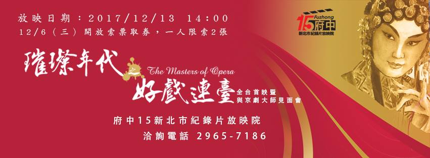 轉知索票訊息-《璀璨年代之好戲連臺》試映會 口碑鼎沸,一致叫好 京劇人的故事,感動人心 老、中、青三代都極力推薦 二小時紀錄片,毫無冷場,一氣呵成 值得一看再看 並紛紛來電問下一場會在哪舉辦呢 導演報告如下 目前最近的一場是12月13日下午14:00 在板橋府中15紀錄片放映院 是全臺首映暨與京劇大師見面記者會 片中演員幾乎都會到場向觀眾致意 免費索票辦法 12/6(三)即開放索票取券,一人限索2張。 開館時間9:00-21:00請至「府中15」一樓服務大廳索取。 或洽府中15新北市紀錄片放映院 洽詢電話 2965-7186 |