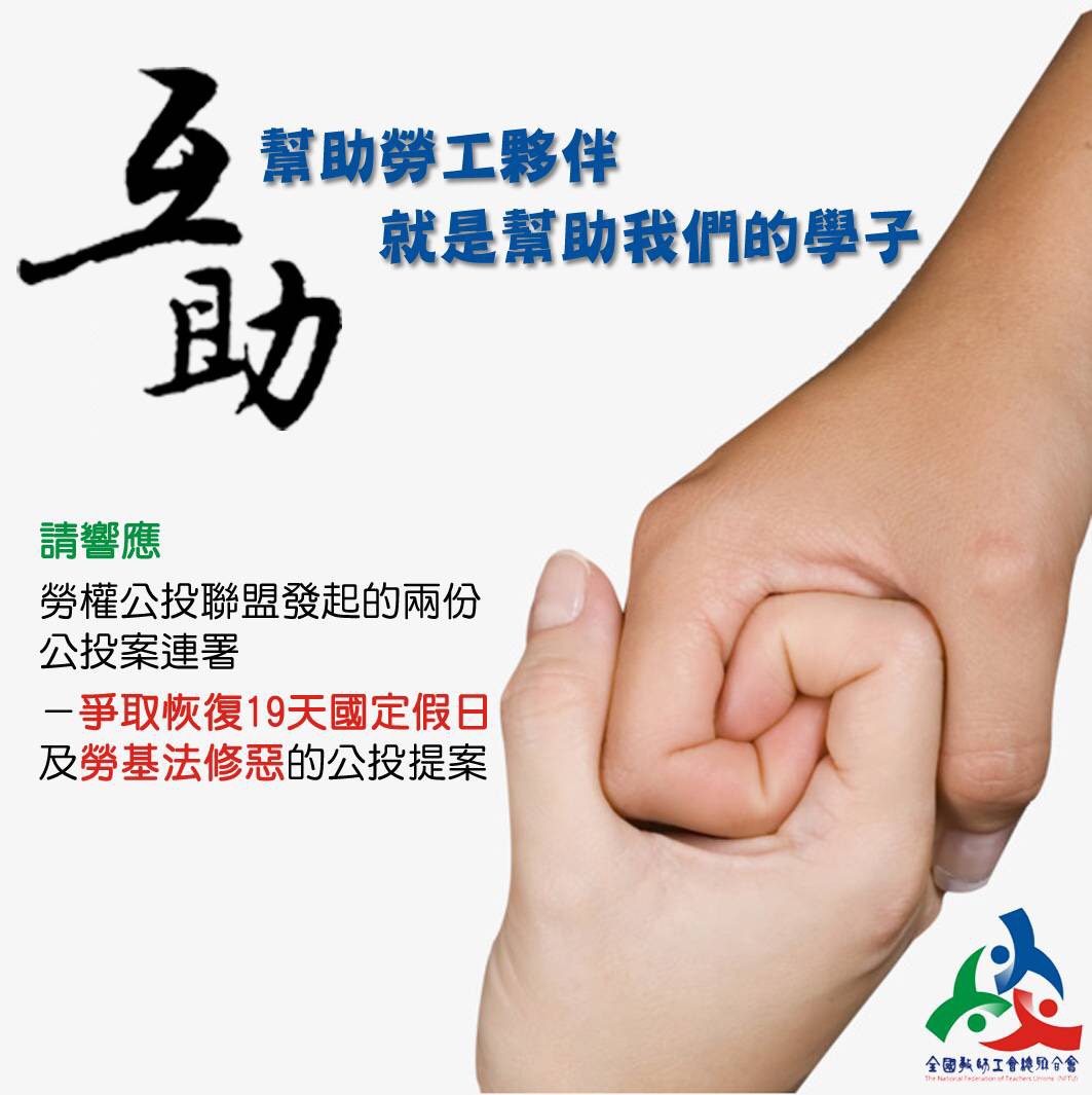 你為老師們教師節、勞動節都沒放假而抱屈嗎?也為諸多勞工親友、家長們遭受嚴重壓榨剝削而忿忿不平嗎? 為人為己,請老師們務必支持這次公投連署,相關說明請見附件檔案,並請會長協助收集連署書後,直接寄至全國教師工會總聯合會(1 0 4 台北市民權西路27號2樓),或投遞至本會(聯絡箱160台北市教師會),由本會轉交給全教總,感謝。