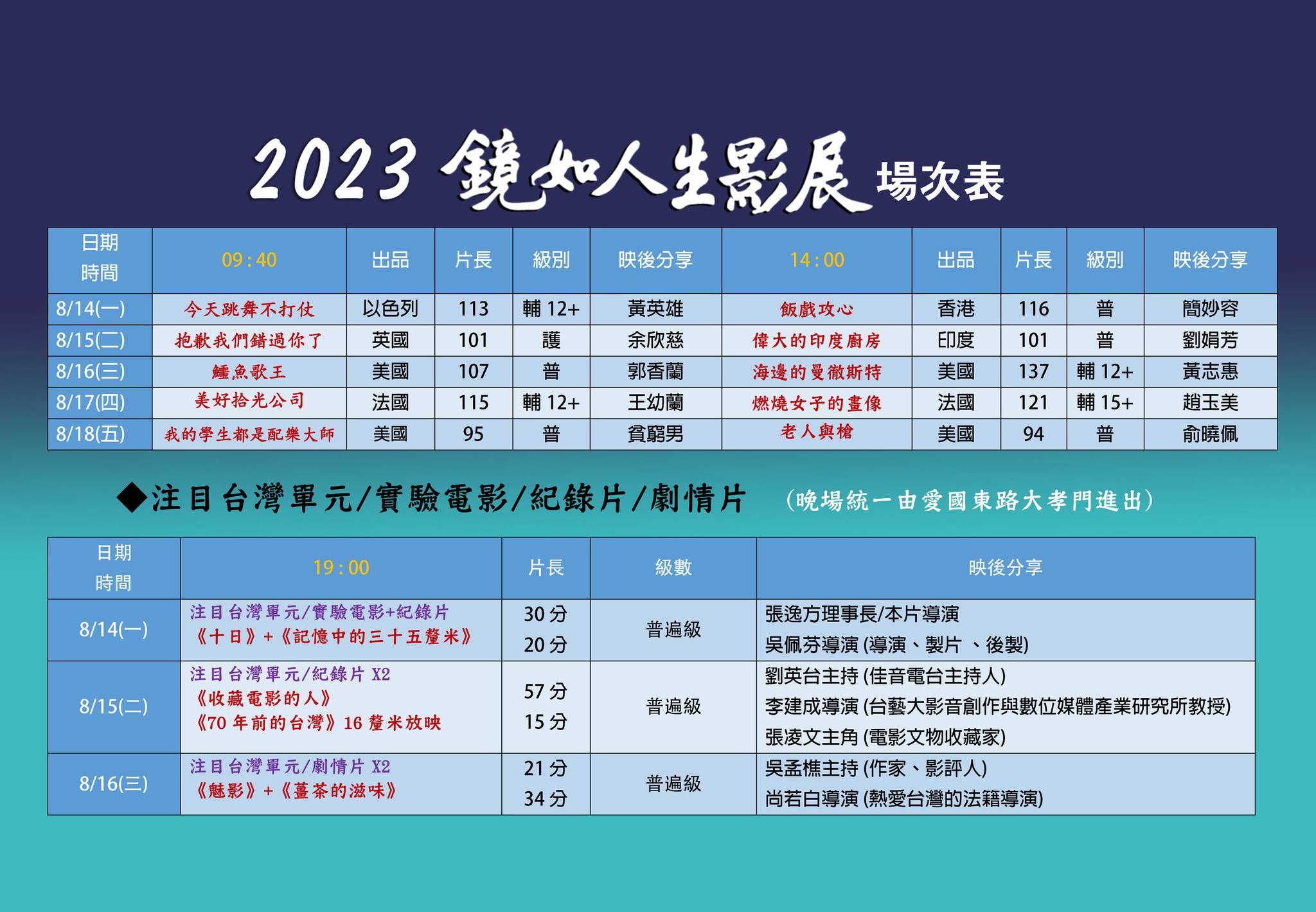 由中華世界影像教育推廣協會本會舉辦《2023鏡如人生影展》將於8月14至18日於中正紀念堂演藝廳共有13場次放映,有來自世界各國的10部劇情長片、1部實驗電影、2部台灣紀錄片和2部劇情短片,場場均有映後分享與觀眾互動,讓電影激活人生,藝術陶冶人性,《2023鏡如人生影展》等著您喔!!。