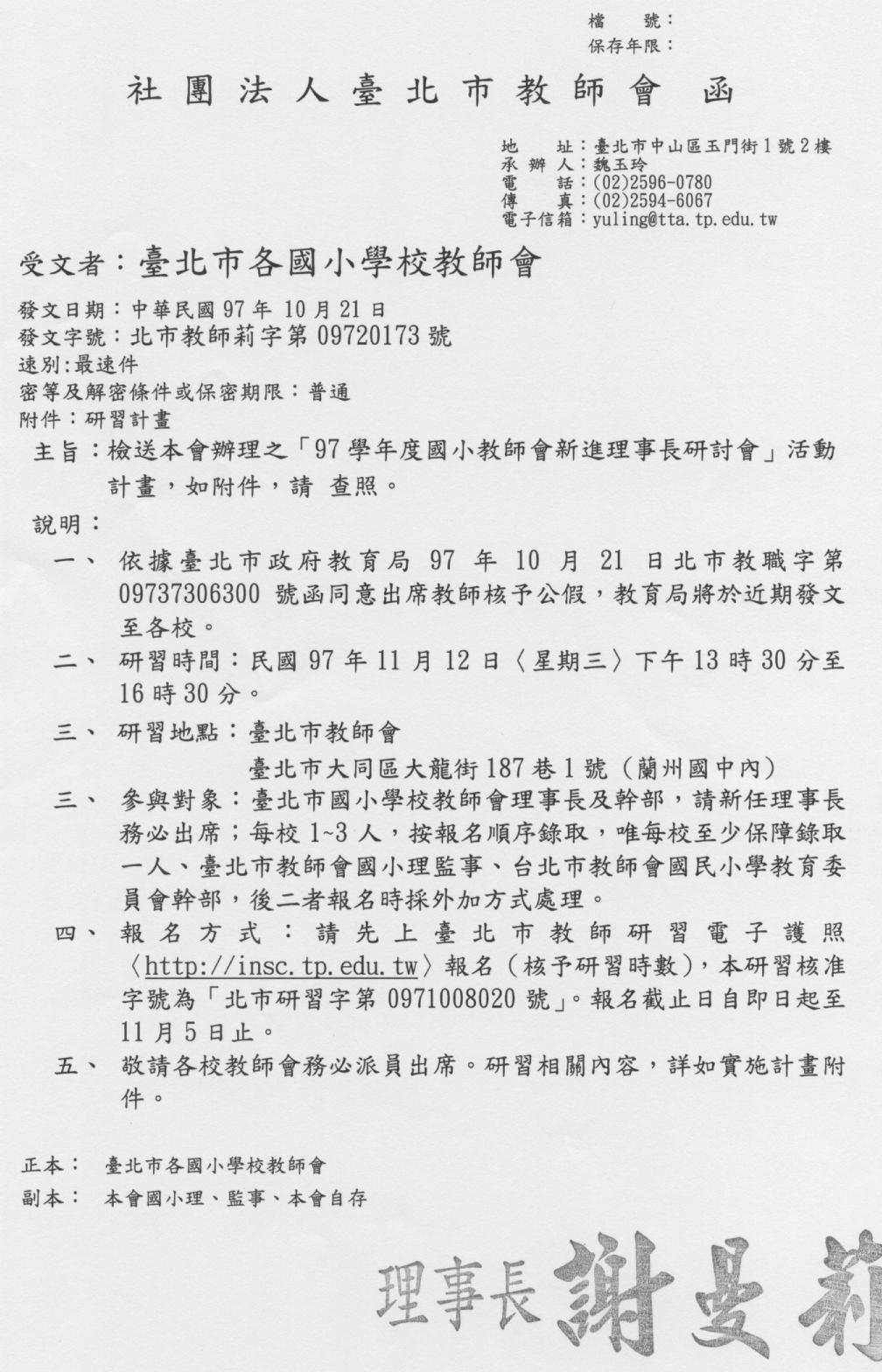 受文者:臺北市各國小學校教師會 發文日期:中華民國97年 10月21日 發文字號:北市教師莉字第09720173號 速別:最速件 密等及解密條件或保密期限:普通 附件:研習計畫