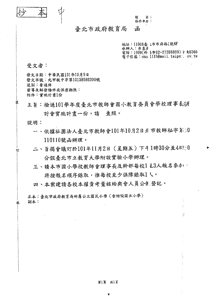101學年度臺北市教師會國小教育委員會學校理事長研討會實施計畫 1.研習目標:(1)教師會幹部經營學校教師會之實務經驗分享。 (2)聽取基層學校教師會之需求,以作為未來進階研討會之籌備方向。 (3)建構區域學校教師會組織聯絡網與支持架構。 2.研習時間:101年11月2日(五) 13:30∼16:30 3.研習地點:臺北市立教育大學附設實驗小學會議室(台北市公園路29號) 4.研習對象:臺北市國小學校教師會理事長及幹部,請新任理事長務必出席。 5.研習人數:每校1~3人,按報名順序錄取,惟每校至少保障錄取一人。 6.研習內容: 時間 課程內容 主持人/引言人 1:30~1:40 相見歡、介紹市教會-----國小教委會及國小教委會幹部 黃志宏 1:40~2:20 教師權益變變變-工作政策報告 ----黃志宏 2:20~2:40 教師會福利報告 ----林鈺玲 2:40~3:10 分區研討 經驗交流與分享 ∼ Coffee break ∼ ----各分區負責人 3:10~4:30 理事長會議──綜合座談 ----黃志宏 7.報名方式:請於報名截止日前逕登入電子護照網站(http://insc.tp.edu.tw)報名,核准文號為「北市研習字第1011002068號」,並列印報名表經學校行政程序核准後,再由學校研習承辦人進入系統辦理薦派報名,為簡化作業程序無須再回傳報名表。 8.報名期限:即日起至 10/29(星期一)止。 9.如有疑問請洽: 魏玉玲秘書 Tel:2596-0780#111