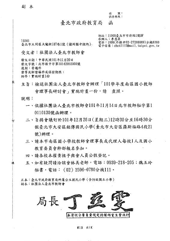 101學年度南區國小教師會理事長研討會實施計畫 一、辦理屬性:南區(大安區、文山區)國小教師會理事長研討會。 二、研習目標:(1)教師會幹部經營學校教師會之實務經驗分享。 (2)聽取基層學校教師會之需求,以作為未來進階 研討會之籌備方向。 (3)建構區域學校教師會組織聯絡網與支持架構。 三、 研習時間:101.12.26 (三) 下午12:30~16:30 四、研習地點:台北市羅斯福路四段85號2F (台北捷運公館站銘傳國小出口) 五、研習對象:(1)臺北市南區國小學校教師會理事長(或代理人),每校1人 (2)國小教委會幹部(名額外加) 六、研習內容:(林 美 老師、吳明哲 老師、王仁宏 老師、姜懿珊 老師、林佩玓 老師) 時間 課程內容 12:30~13:30 相見歡 13:30~14:30 重要政策說明。 14:30~15:00 如何經營學校教師會? 15:00~15:30 如何在學校內有效的傳遞訊息? 15:30~16:30 經驗交流與分享 ∼ Coffee break ∼